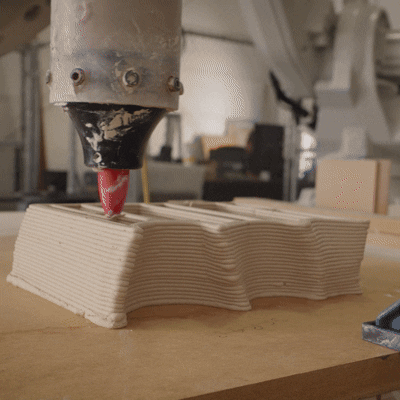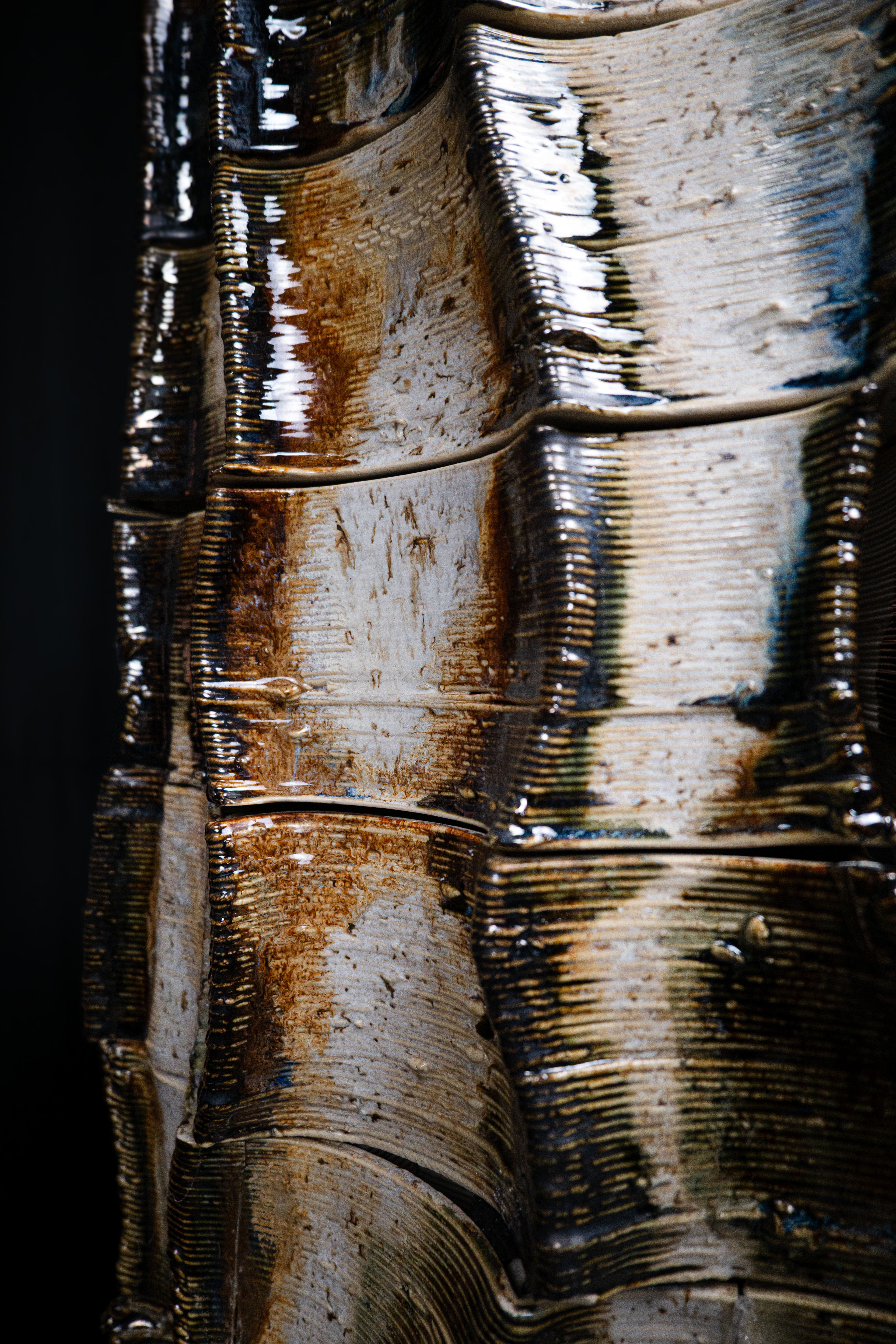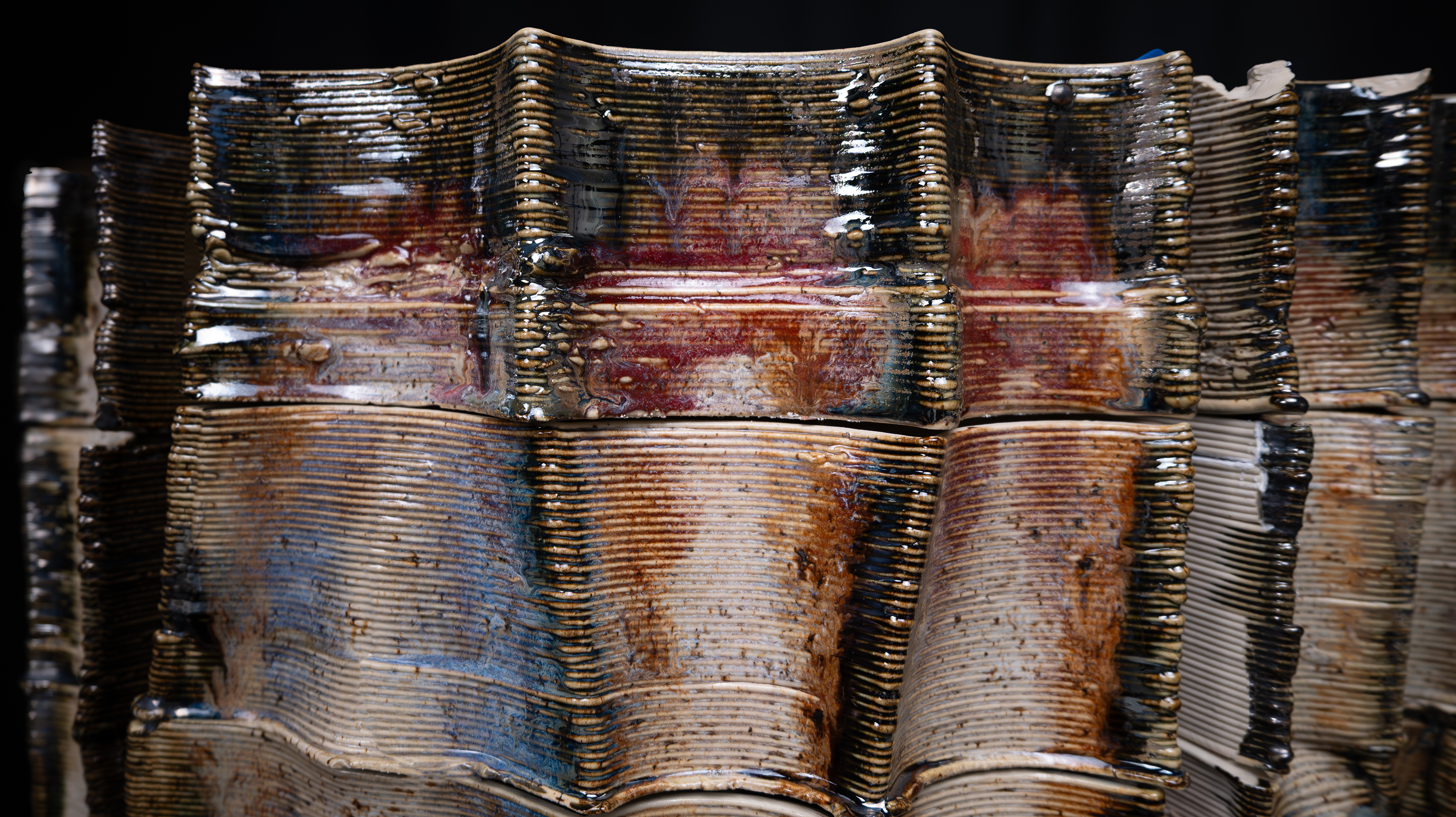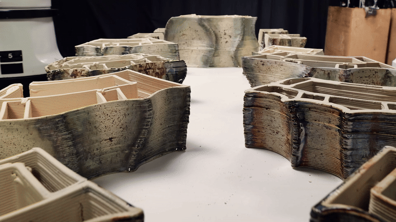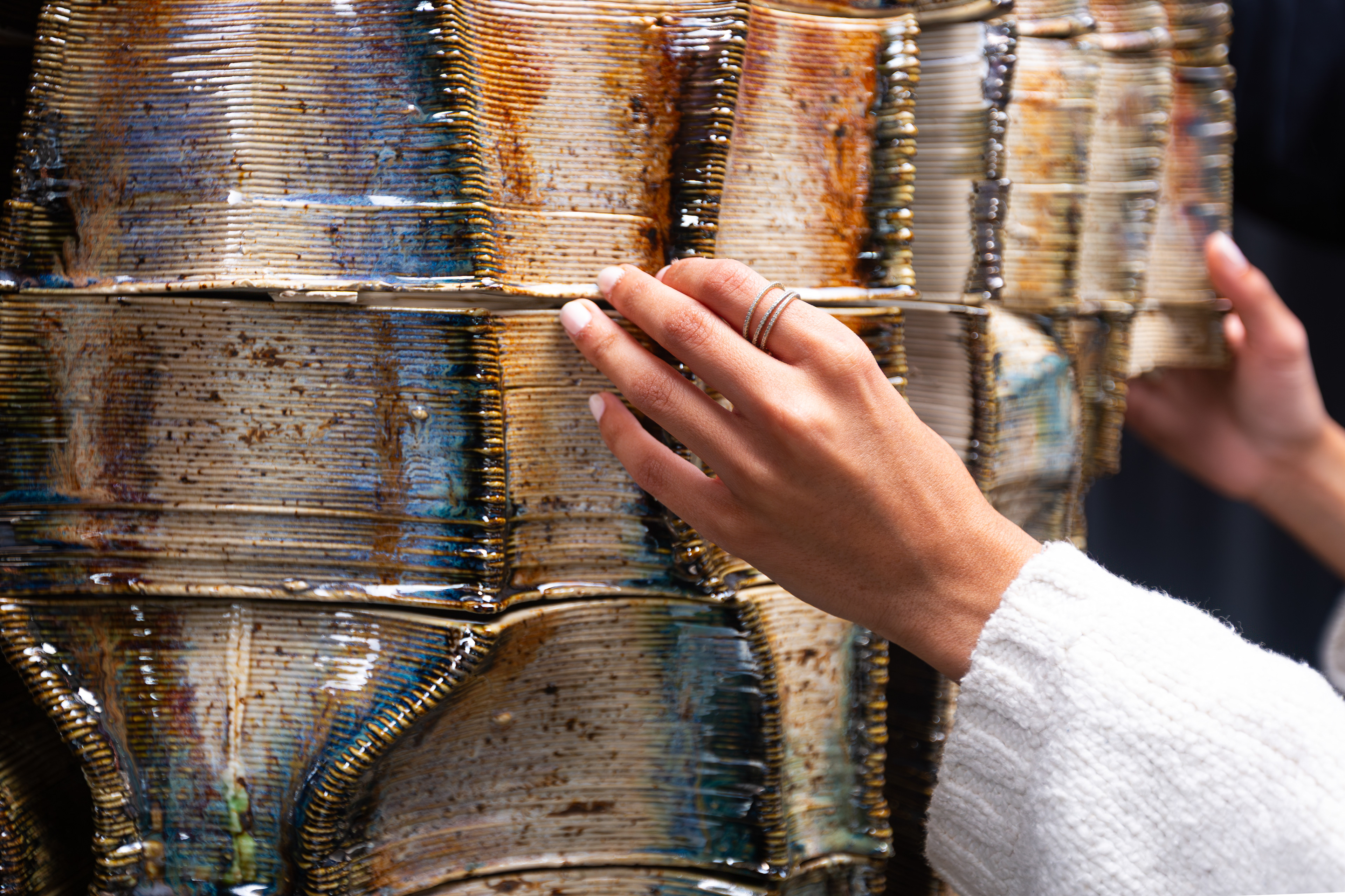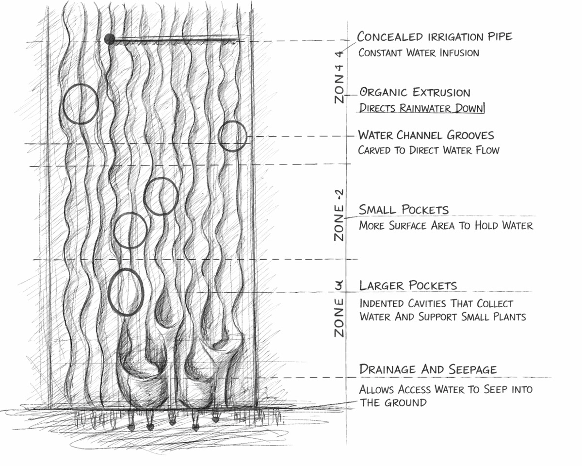 The facade started with an idea of water flow, layered channels that direct, integrate, and modulate rainwater between interior courtyards and exterior envelopes. The outer skin envelopes are articulated through organic extrusions produced by a process of robotic 3D printing ceramics supported by rammed-earth and rebar substructures. Here, this composite assembly forms an uninterrupted enclosure for water flow, mediating light and stillness.