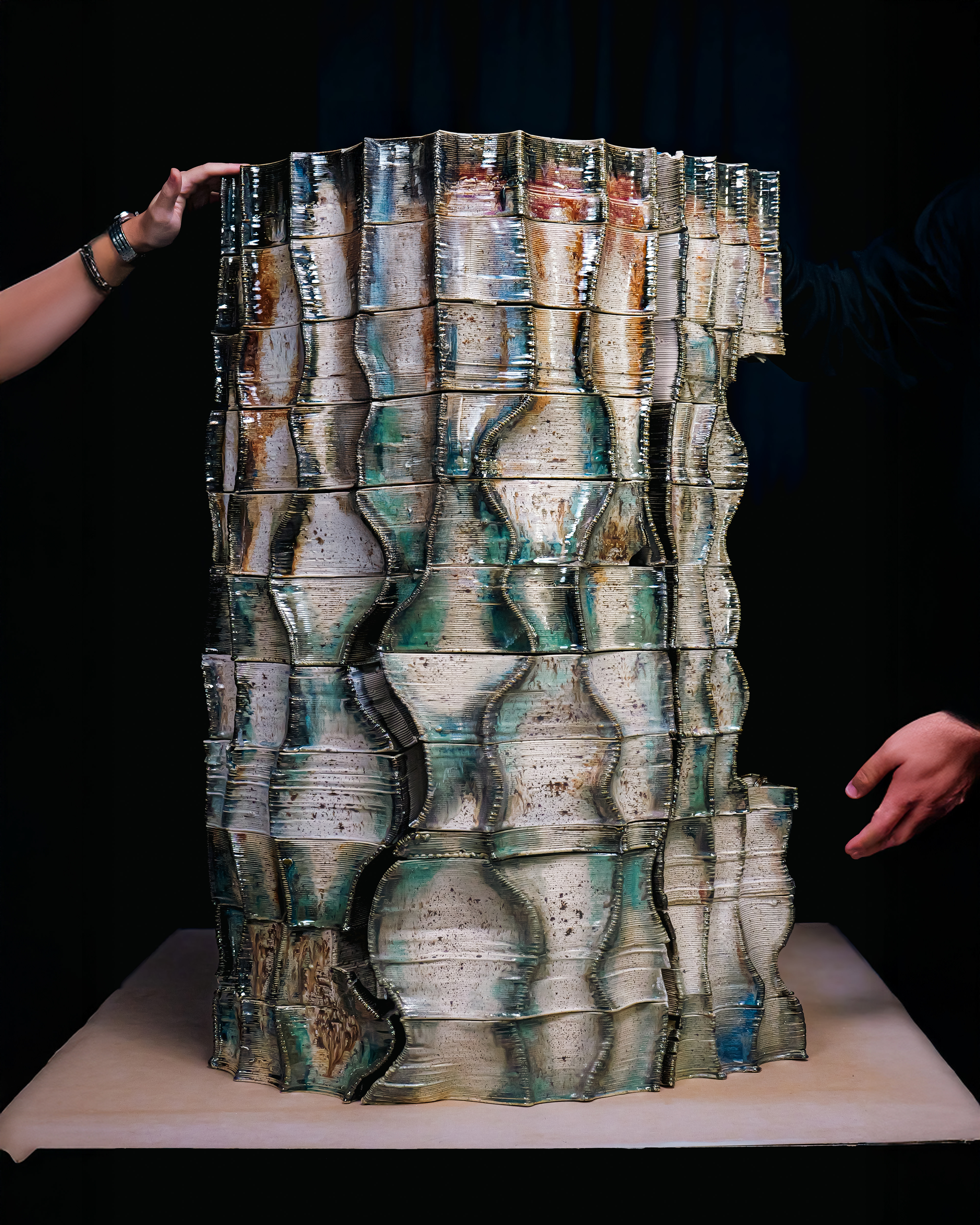 Finally, each masonry unit is finished with a calibrated vertical gradient of ceramic glazes that reinforces the project’s undulating yet restrained formal expression. The chromatic transition—from muted, warm tones at the base to more saturated hues at the edges—articulates the project’s conceptual framework while generating nuanced visual depth within its environmental context