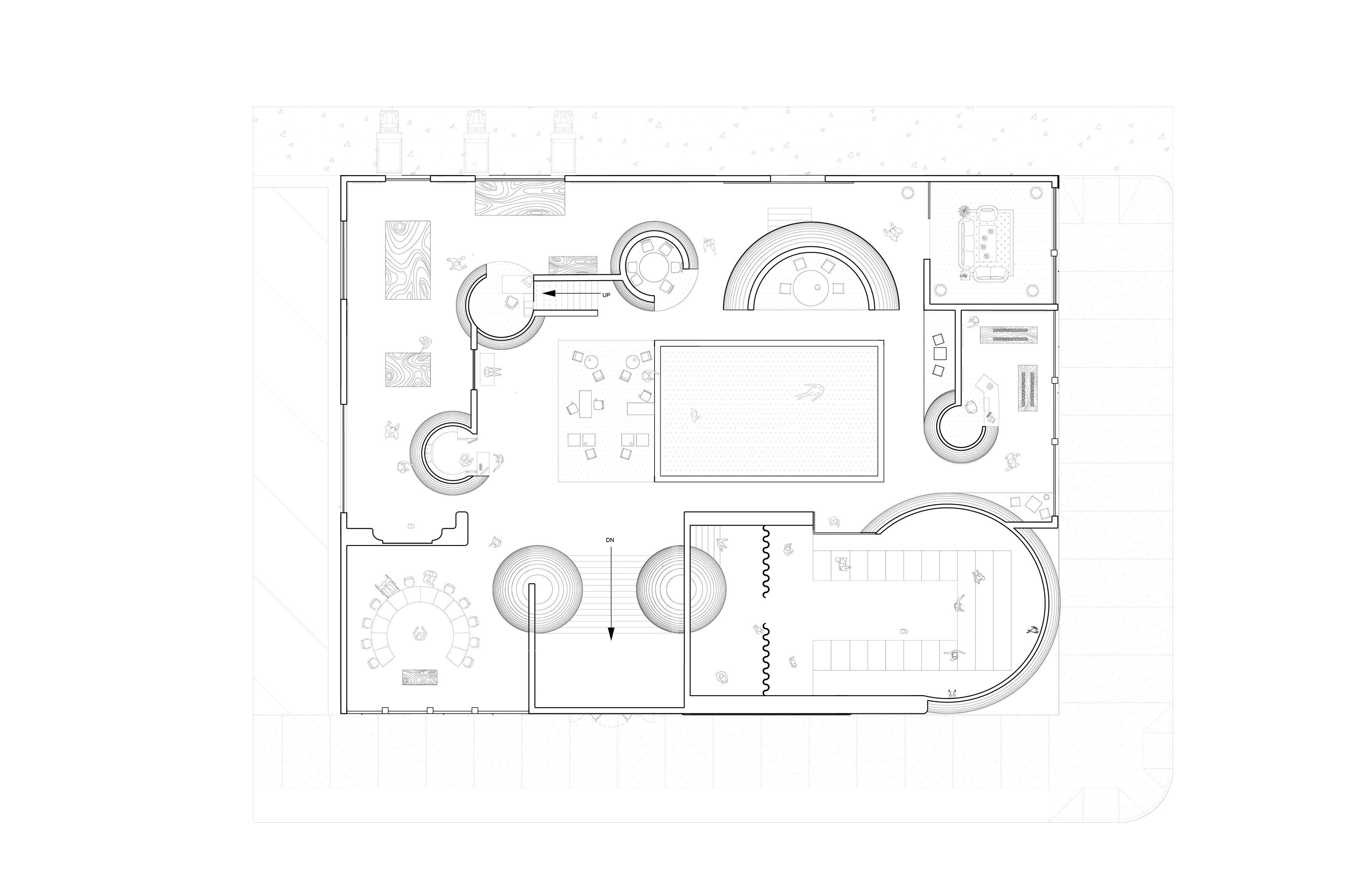IN_AROUND/BETWEEN is a design proposal for a three-story cultural center in Chicago—a civic landmark for American architecture, collective identity, and cultural plurality. Inspired by Chicago’s diverse cultures, the project advances the idea of collective identities: a transitional condition in which no single identity of a room dominates, but instead fuses, overlaps, and coexists within the whole. Spheres and popped colors act as spatial components of identity—distinct yet interdependent—organizing circulation, compressions, and encounters while expressing individuality within a shared system. Operating across interior movement and exterior form, these elements visualize coexistence rather than separation. At its core, the project challenges conventional notions of doors s, proposing a collective rhythmic system in which there is no separation and no boundaries.
