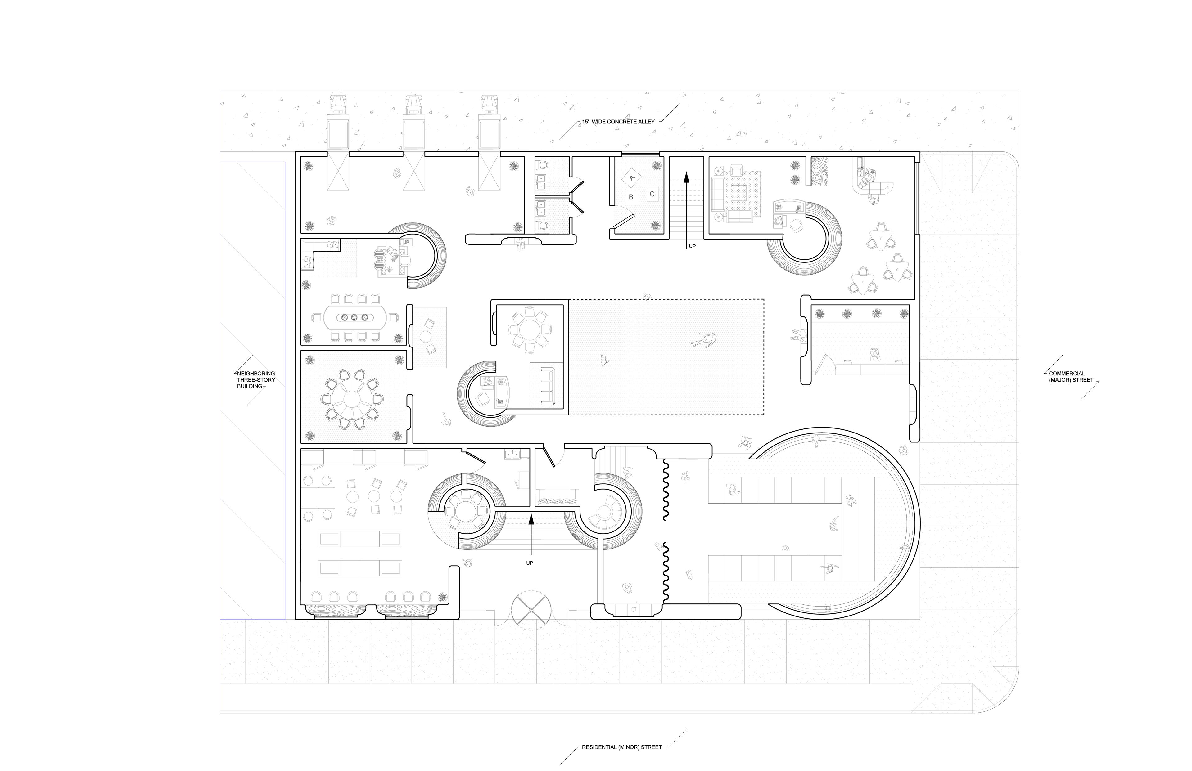 Internally, each sphere is strategically positioned at pivotal intersections between rooms, corridors, and entries, operating as moments of pause, overlap, and contemplation. The central atrium becomes the primary source of pop-colored light, anchoring the building while radiating color, orientation, and identity outward—shaping transitional sequences and spatial experiences across all levels of the interior.
