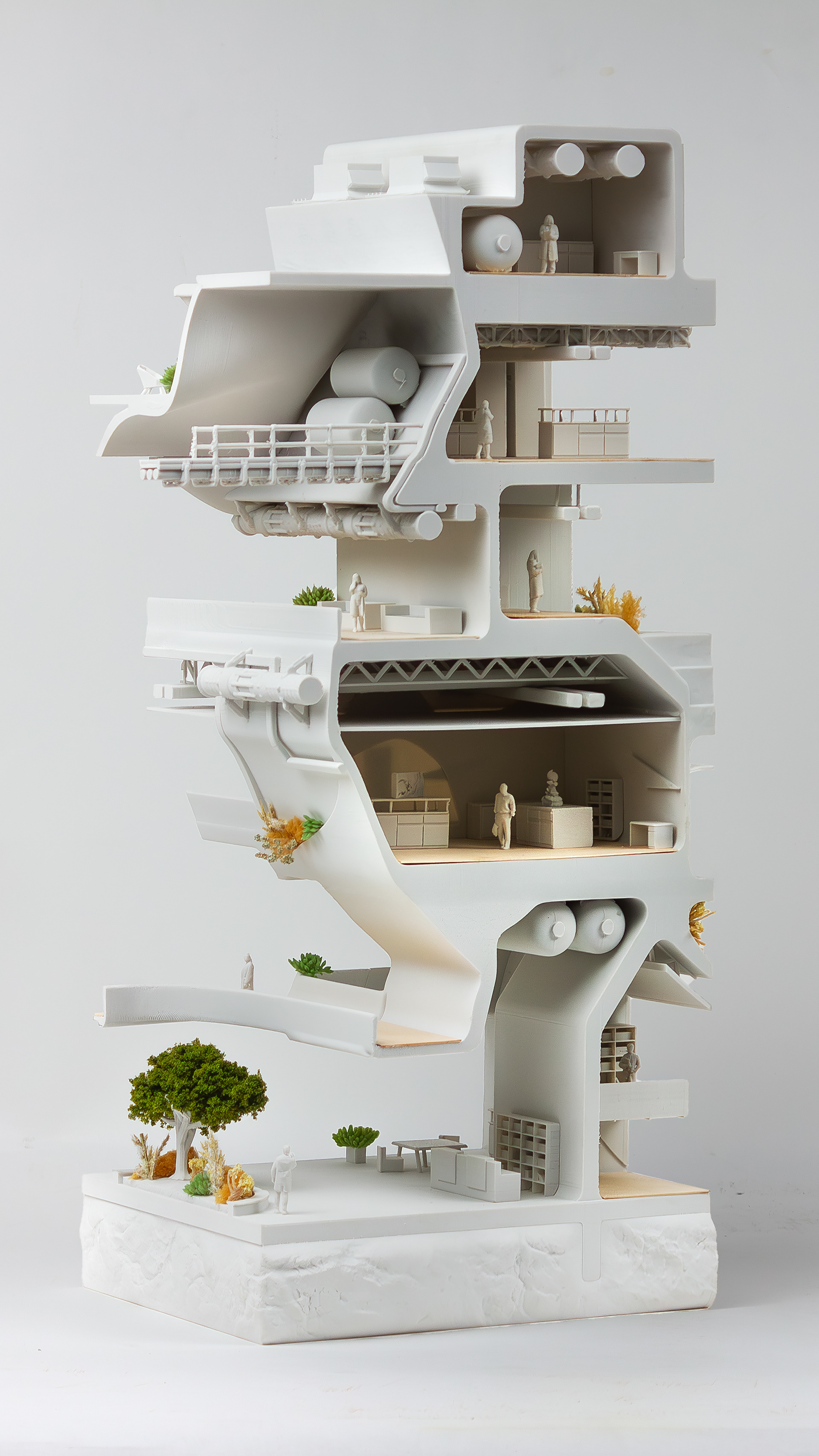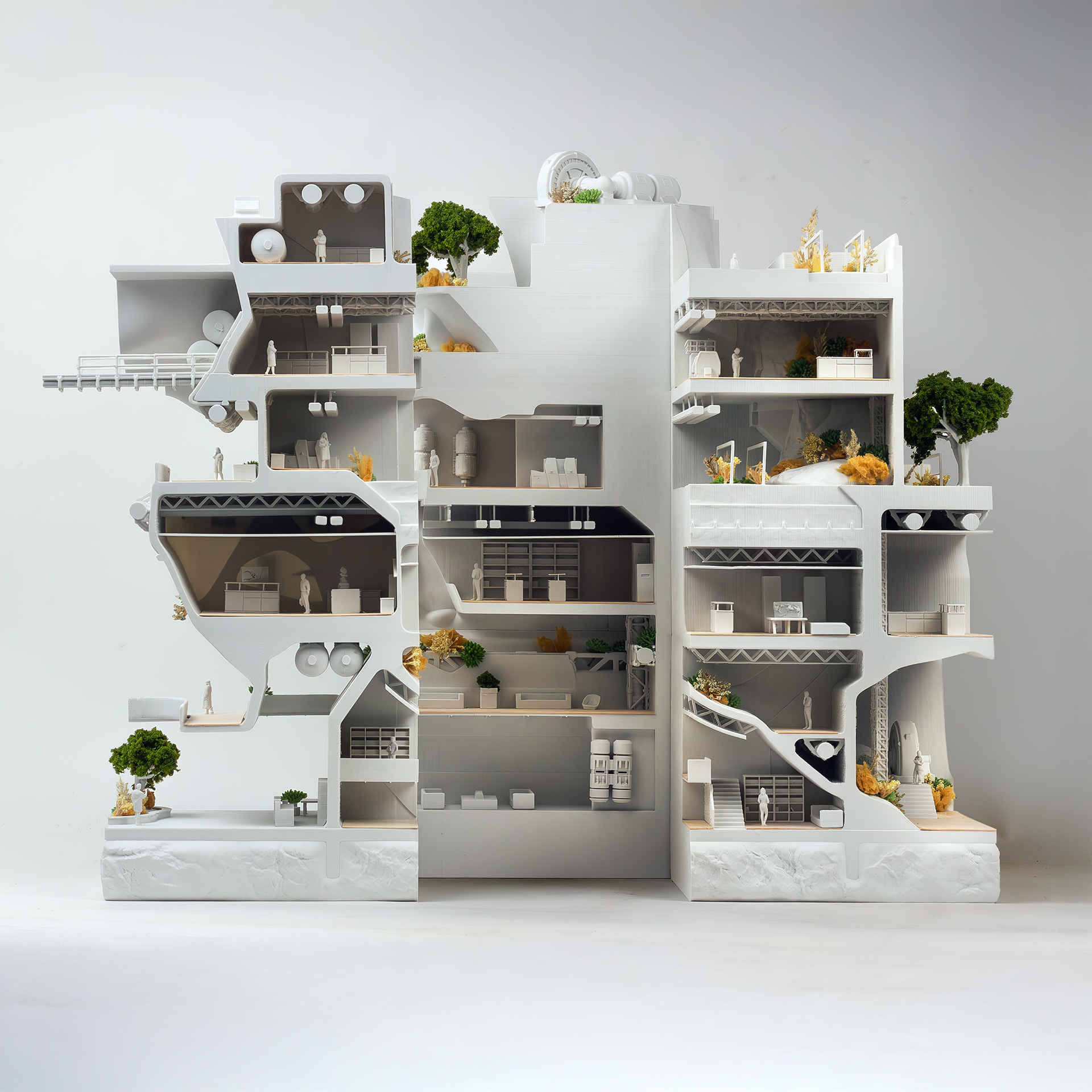 At the heart of the building lies a central atrium, a light-filled void that weaves together the lab spaces and the public realm, inviting light and circulation to flow freely throughout. Above, two roof terraces become sites of outdoor research—laboratories for testing plant resilience in urban environments where soil and water are scarce, and sanctuaries for those who occupy the space.