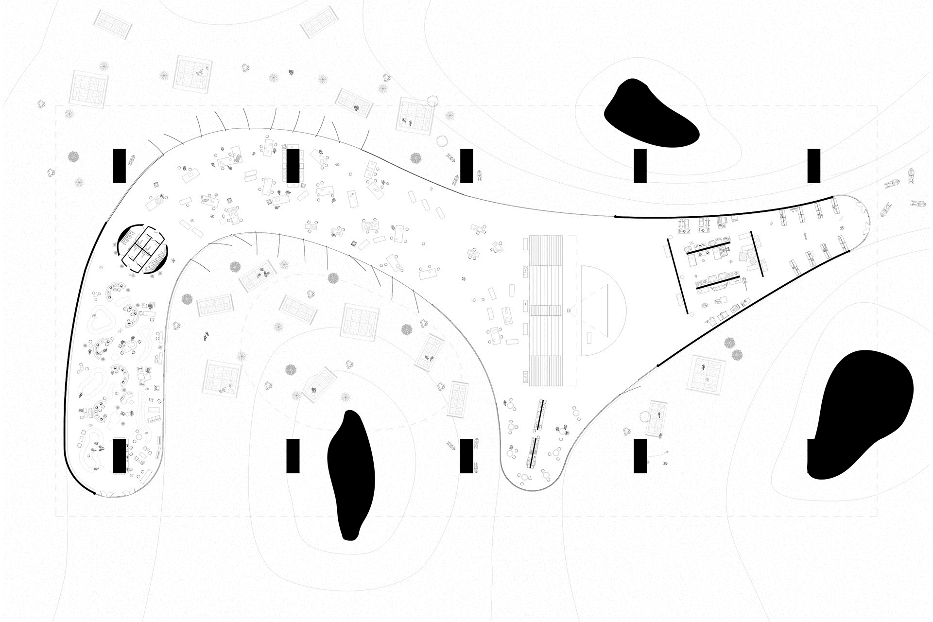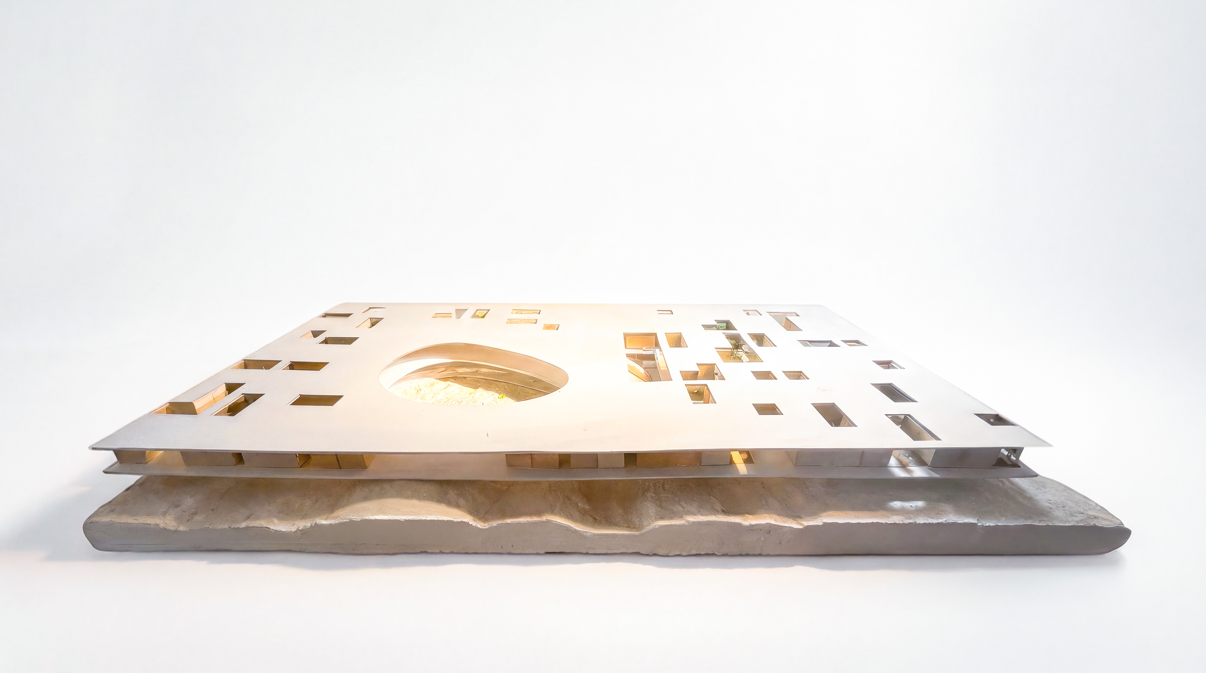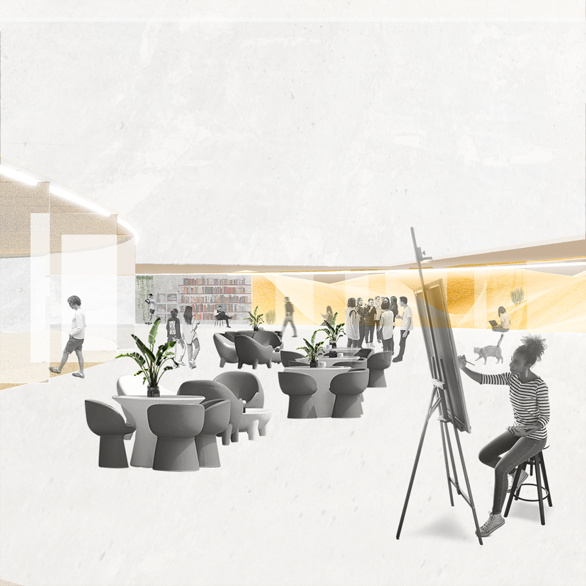 Internally, the central atrium—shaped by the contours of the dune topography—is positioned as a pivotal intersection between the two platforms, disrupting established circulations, typologies, and programs. Above, the inhabitable roof operates as a gridded communal framework, structured like an urban fabric where distinct neighborhoods support varied residential configurations, shared amenities, and integrated greenery. Below, the valley platform unfolds as a continuous academic area, enabling uninterrupted circulation between studios, study areas, and production spaces.