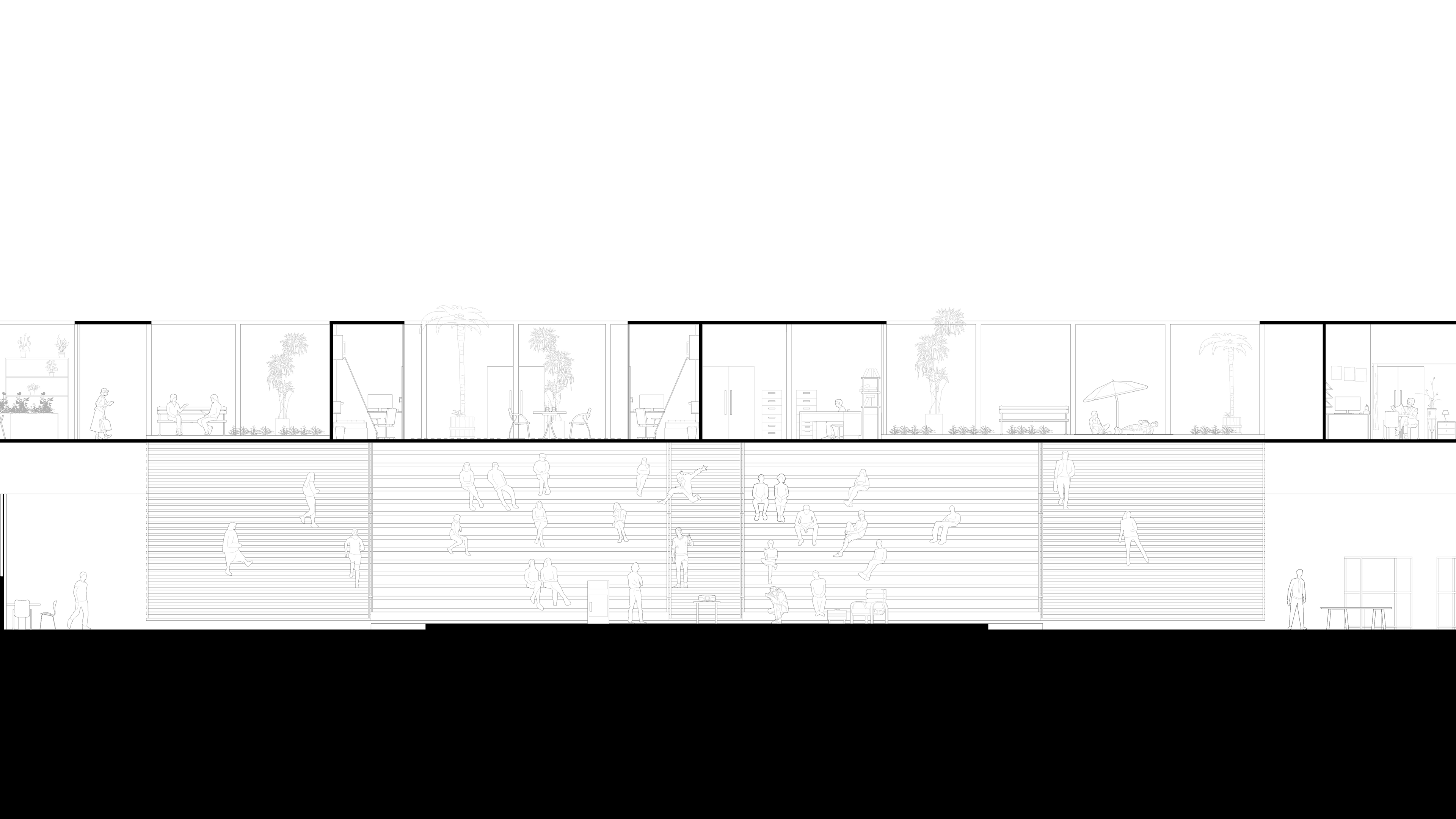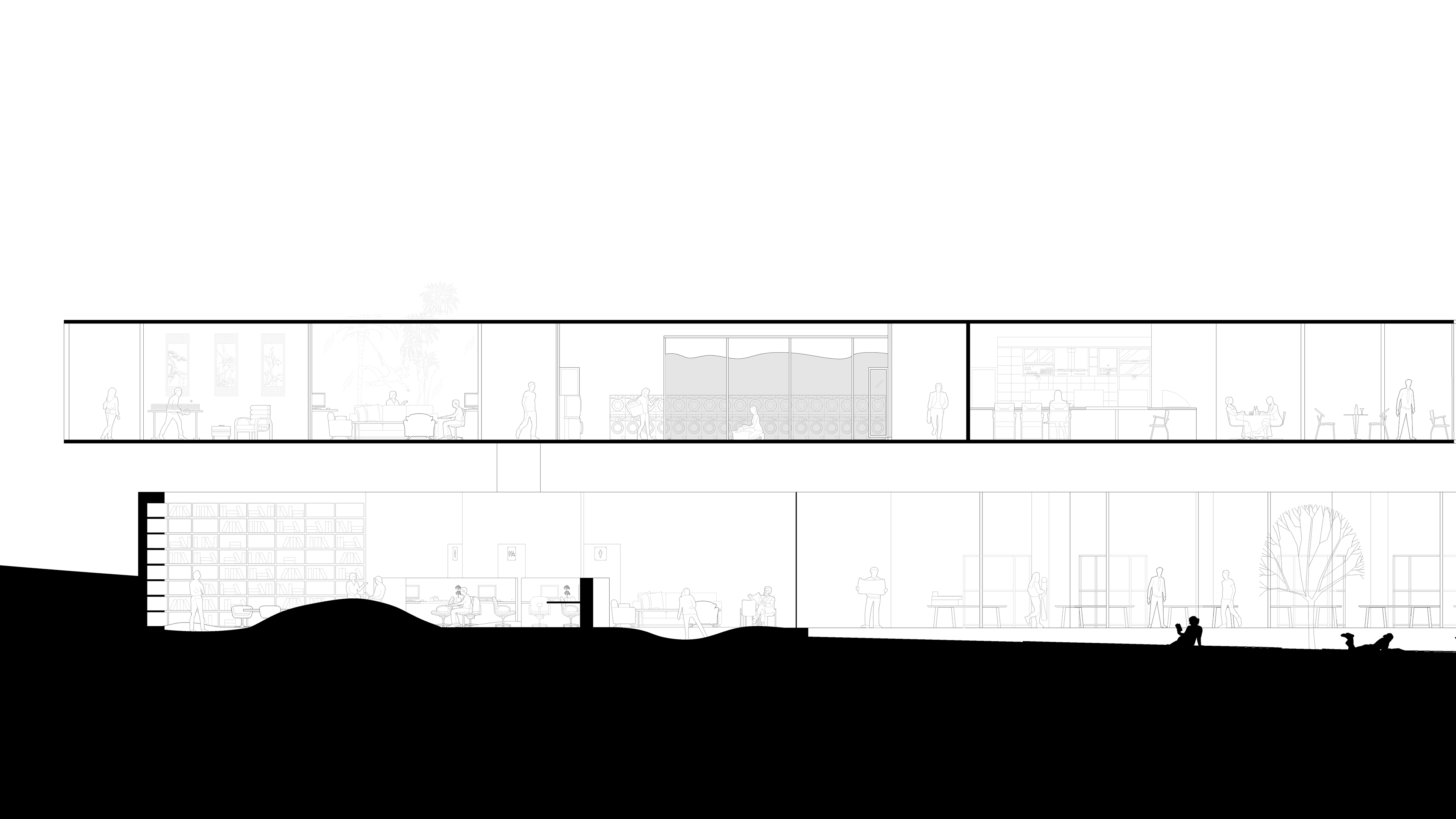 Detailed sections reveal the layered spatial organization and structural composition defining the relationship between the habitable roof and the valley platform. While the roof follows a conventional gridded order of rooms, corridors, and amenities, the valley adopts dune-like formal expressions across interior and exterior spaces. Together, these systems produce coexistent discrepancies and connections, articulating distinct yet interdependent spatial and functional identities within the system.